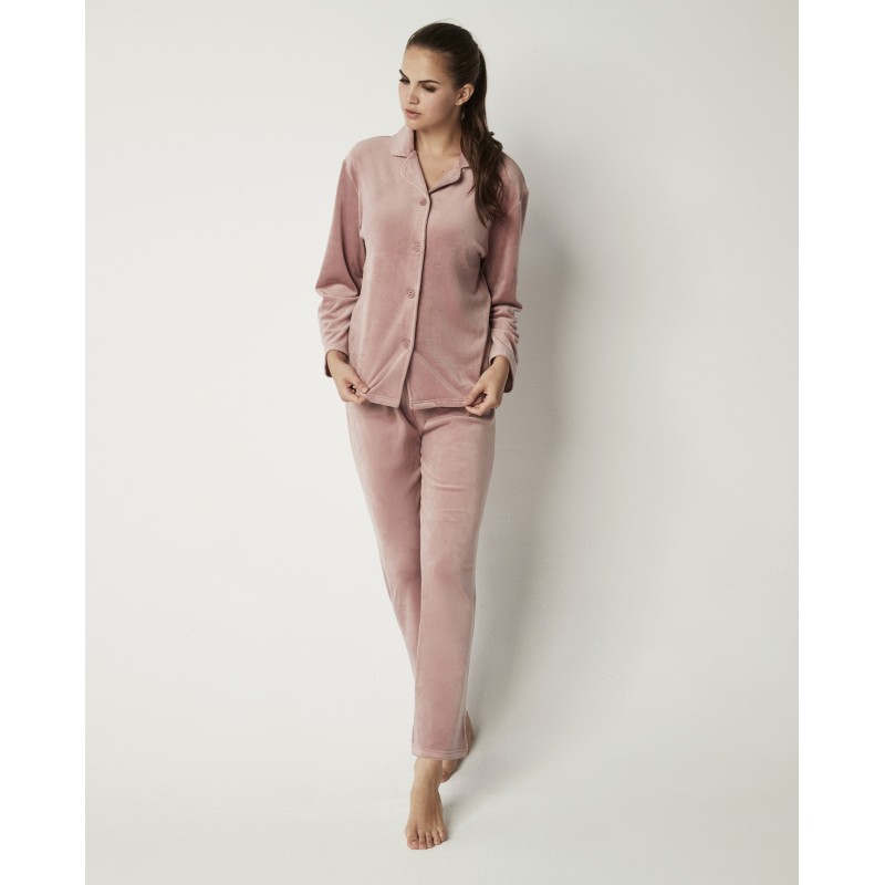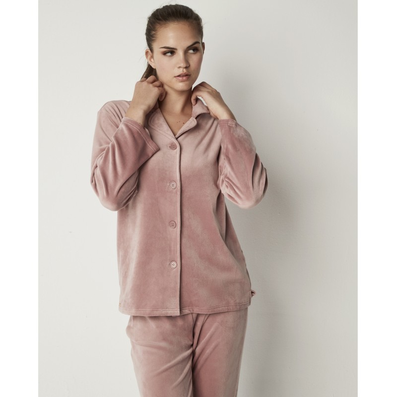 Pijama estilo camisa com decote em V e abertura frontal com botões e calças compridas. A sua textura extra macia e o design de duas peças proporcionam conforto e elegância, perfeitos para dormir ou ficar em casa este inverno.