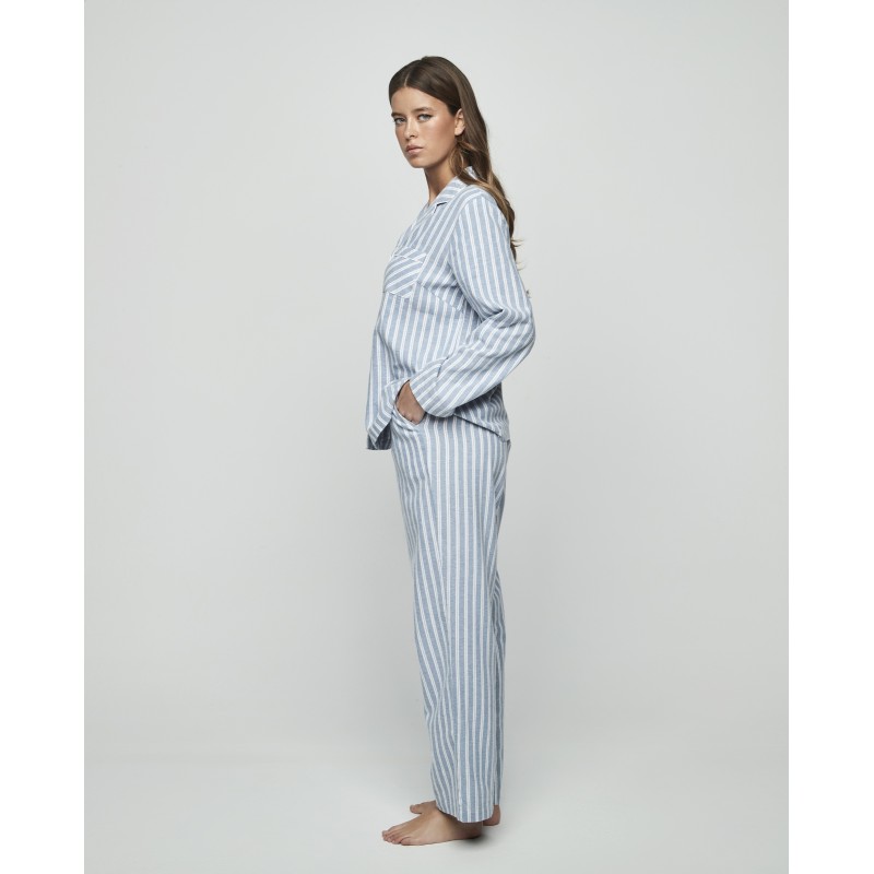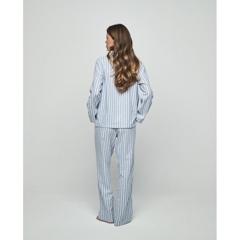Pijama de senhora de duas peças. Apresenta uma parte superior estilo camisa com botões frontais; a parte inferior apresenta calças compridas com laço ajustável, clássicas e elegantes. As riscas verticais realçam o design e conferem-lhe um toque clássico. Estas peças têm uma textura macia, leve e agradável e são 100% algodão.