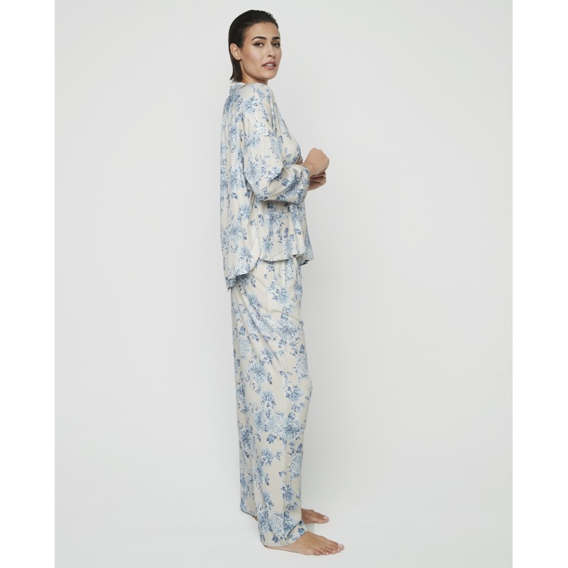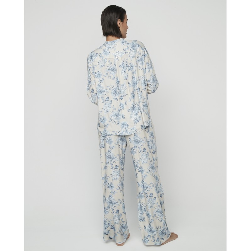 Pijama de mulher de duas peças. Apresenta uma blusa estilo camisa com botões na frente e calças compridas de corte clássico na parte inferior. O seu delicado estampado floral em tons pastel acrescenta um toque romântico e elegante, ideal para noites aconchegantes e discretas.