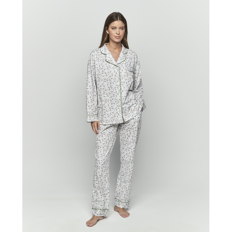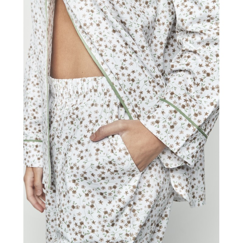 Pijama de mulher de duas peças. Com uma blusa estilo camisa com botões à frente e calças compridas de corte clássico na parte de baixo. Apresenta um estampado floral romântico que proporciona suavidade, frescura e charme. Conforto absoluto para os seus momentos em casa.