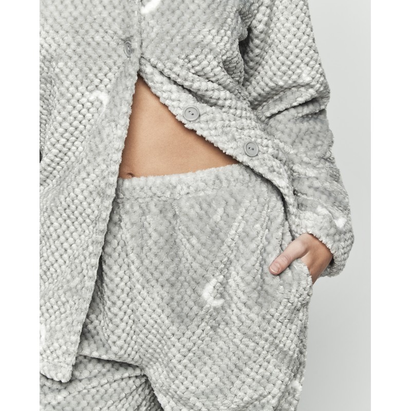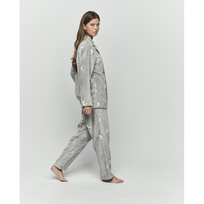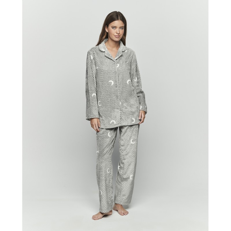 Pijama de mulher de duas peças. Apresenta uma blusa estilo camisa com botões na frente e umas calças compridas de corte clássico na parte inferior. Graças ao seu tecido super macio, relaxar em casa com este conjunto será a sua melhor opção. Este estampado combina elegância e conforto para o seu descanso.