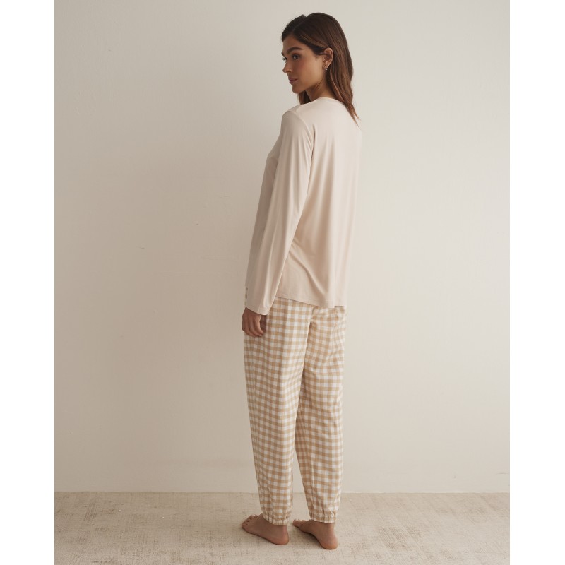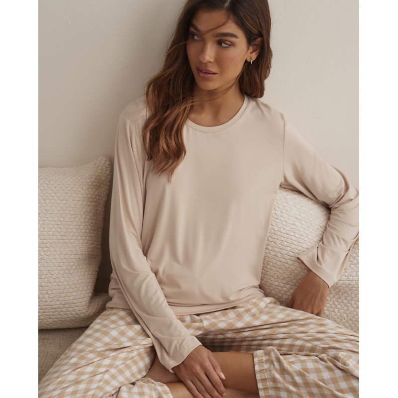 Pijama de mulher de duas peças. Inclui t-shirt de manga comprida com gola redonda, estampado liso e 95% bambu. As calças compridas são 100% algodão, com bolsos e um design riscado, clássico e elegante que nunca passa de moda. Ideal para este inverno.