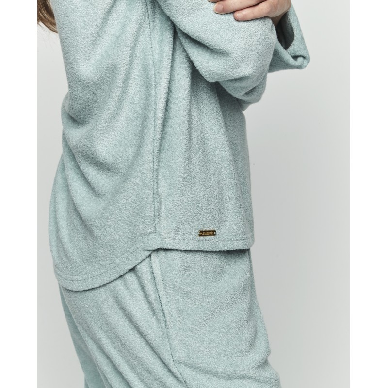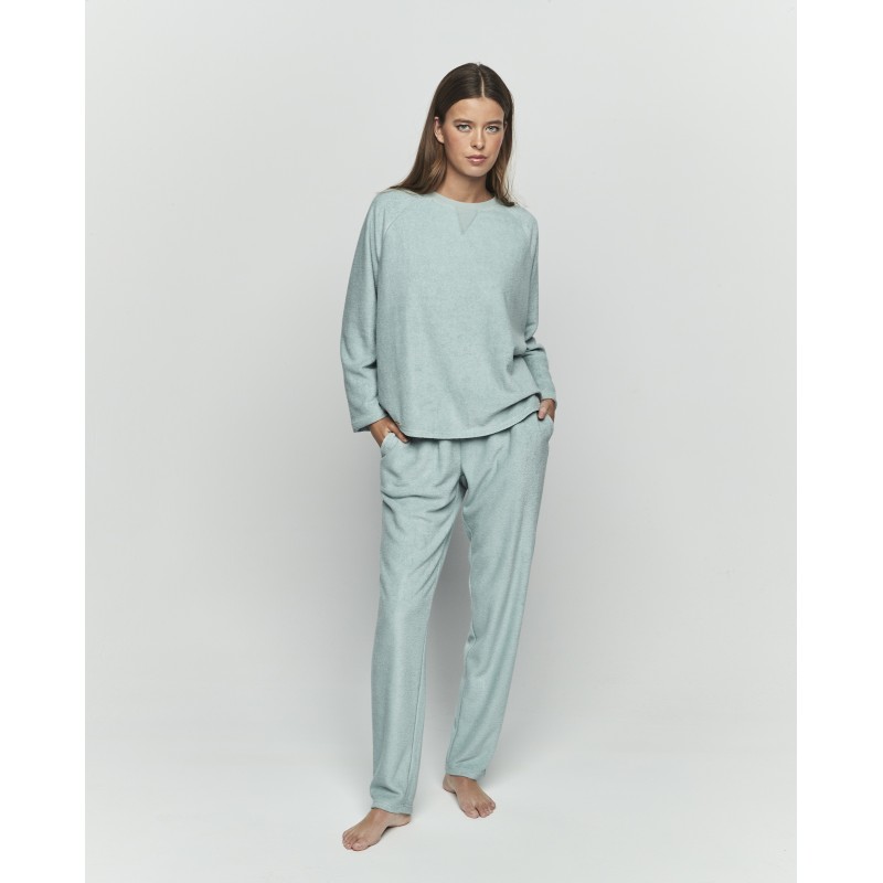 Pijama de senhora de duas peças. Feito de tecido extramacio, inclui uma blusa de manga comprida com gola redonda e calças compridas com bolsos e gravata ajustável. Uma peça pensada para envolver as suas noites em calor e conforto, porque não há sensação mais reconfortante do que se sentir em casa.