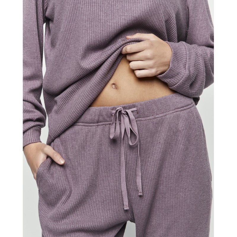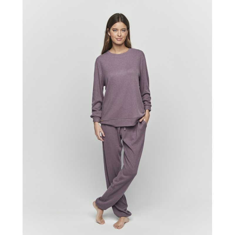Pijama de senhora de duas peças. Fabricado em tecido extramacio, inclui blusa e calças de manga comprida com gola redonda e calças compridas com atilhos ajustáveis. Ideal para noites tranquilas, onde o conforto e a sensação de estar em casa são as principais características.