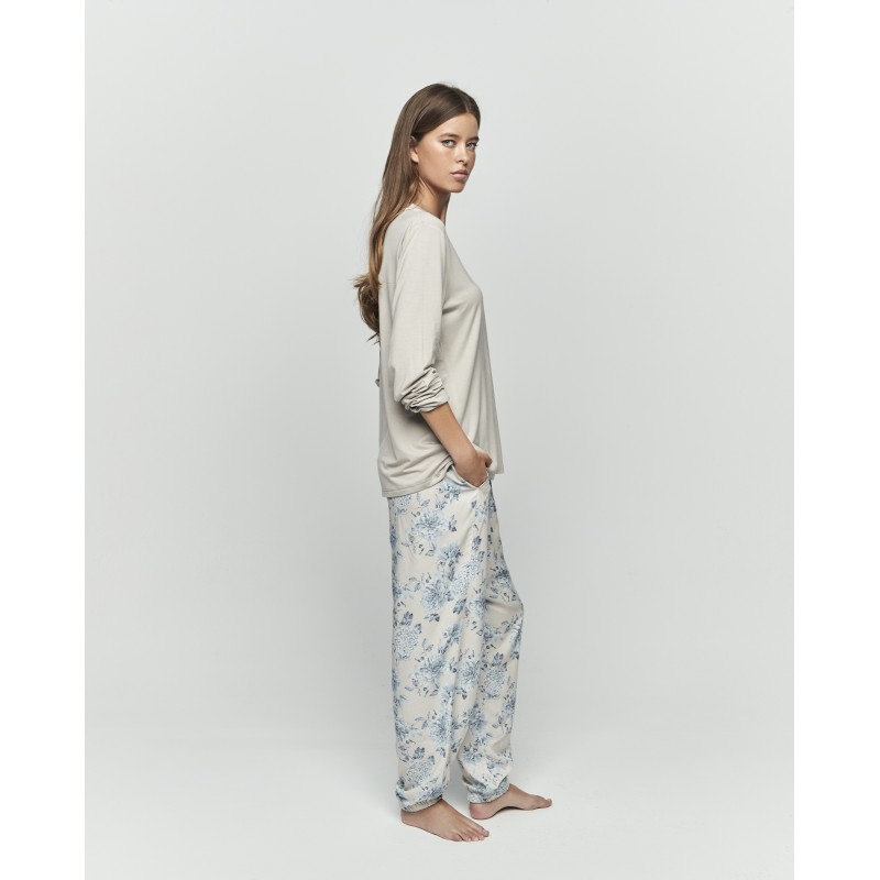 Pijama de mulher de duas peças. Fabricado em tecido extramacio, inclui blusa e calças de manga comprida com decote em V e calças compridas com punho. O delicado estampado floral em tons pastel acrescenta um toque romântico e elegante, perfeito para noites aconchegantes e discretas.