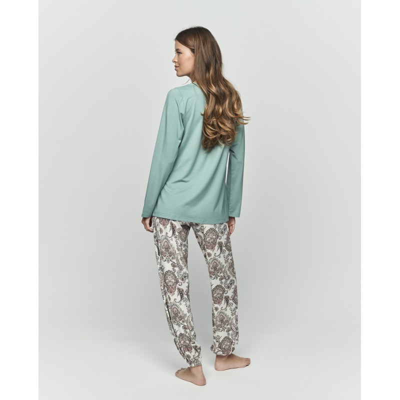 Pijama de mulher de duas peças. Inclui blusa e calças de manga comprida com decote redondo e calças compridas com punho. Relaxe com estilo com esta camisola clássica que, graças ao seu estampado requintado, combina elegância e conforto para o seu descanso.
