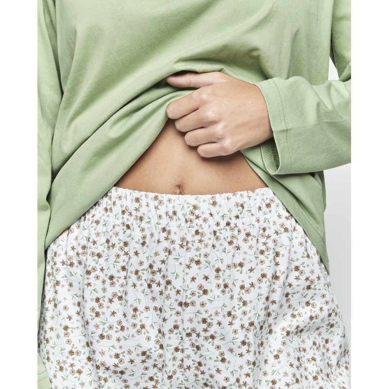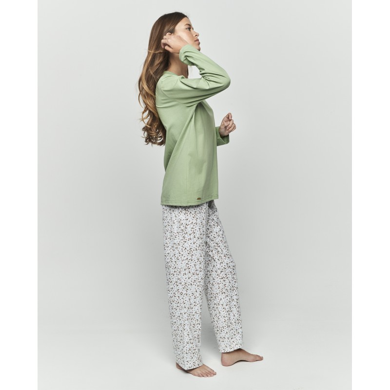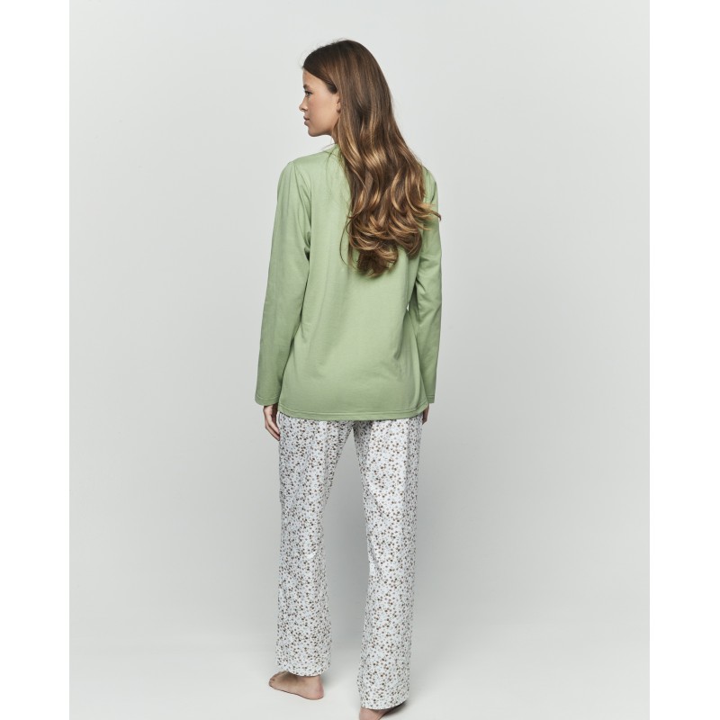 Pijama de mulher de duas peças. Inclui uma blusa e umas calças lisas de manga comprida com decote em V, bem como umas calças compridas com um estampado floral romântico que proporciona suavidade, frescura e charme. Conforto absoluto para os seus momentos em casa.