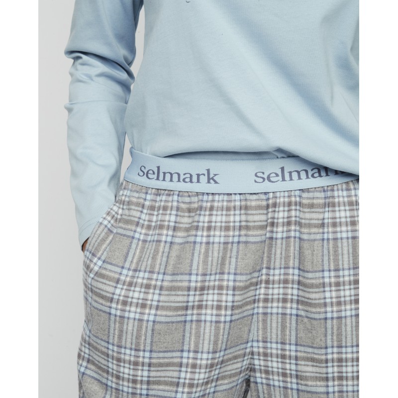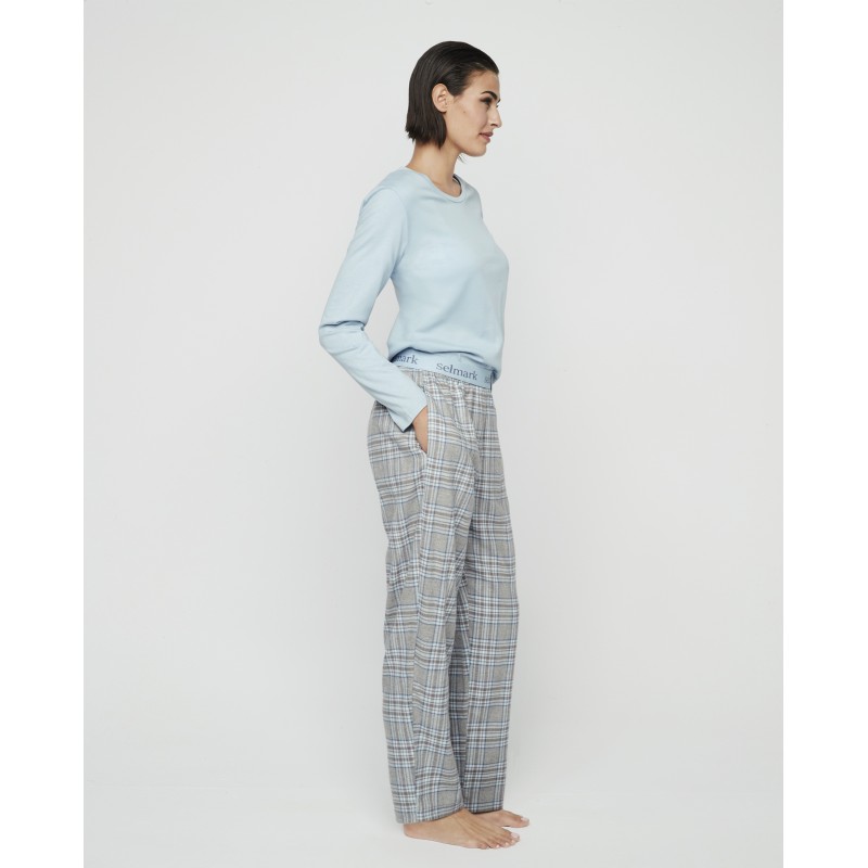 Pijama de mulher de duas peças. Inclui blusa e calças de manga comprida com gola redonda e calças compridas com bolsos. Com um estampado xadrez intemporal, este pijama combina estilo e conforto para as suas noites tranquilas.
