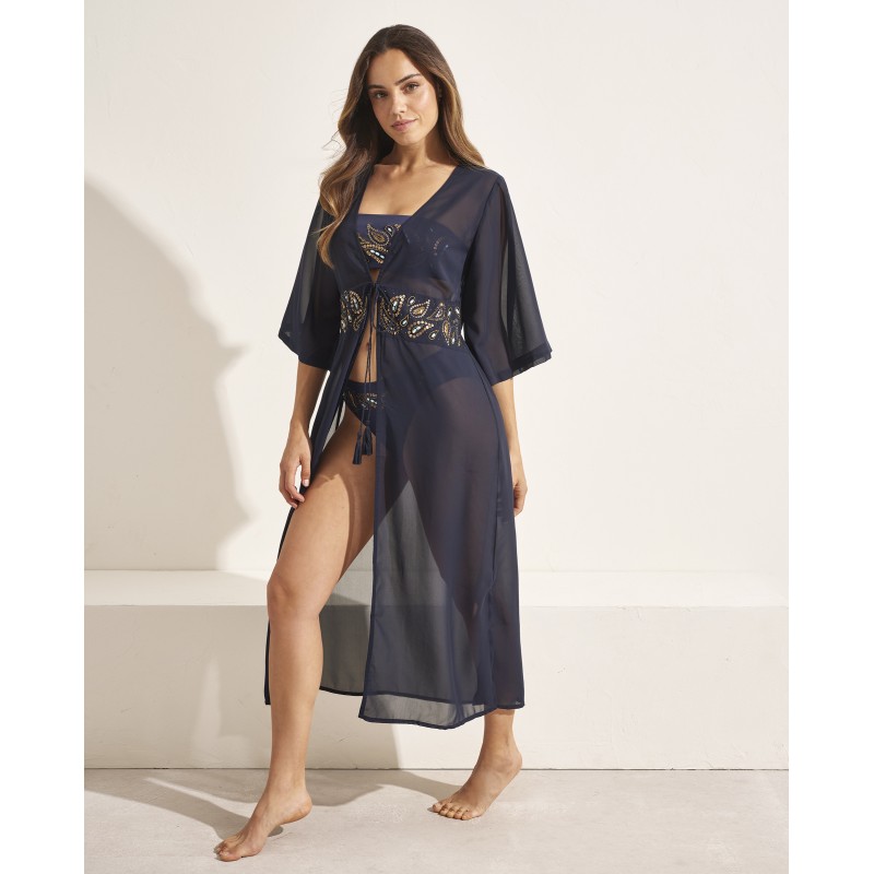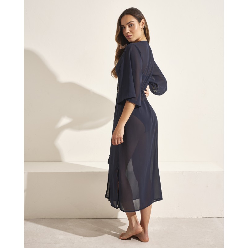 Quimono. Esta coleção sustentável feita de materiais reciclados é inspirada no azul profundo do Lago Baikal. Este design é complementado pelos seus elegantes detalhes decorativos que o tornam numa peça única e distinta.