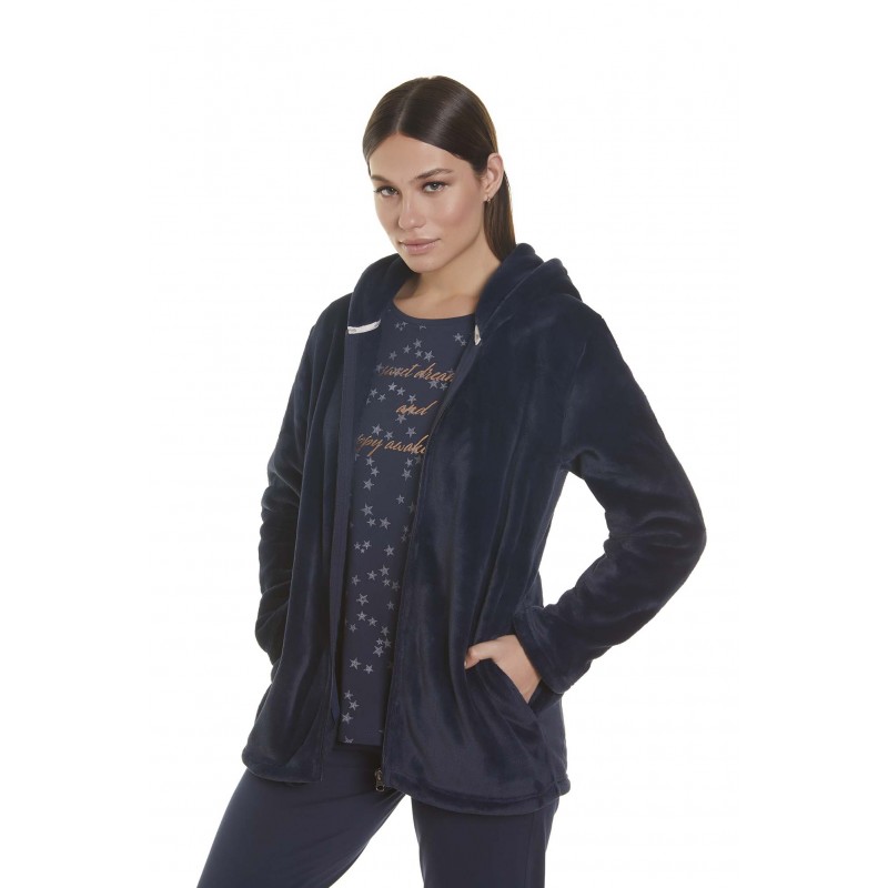 Robe curto estilo jaqueta com fecho frontal. Um design aveludado que se torna uma peça confortável e ideal para a estação mais fria do ano.