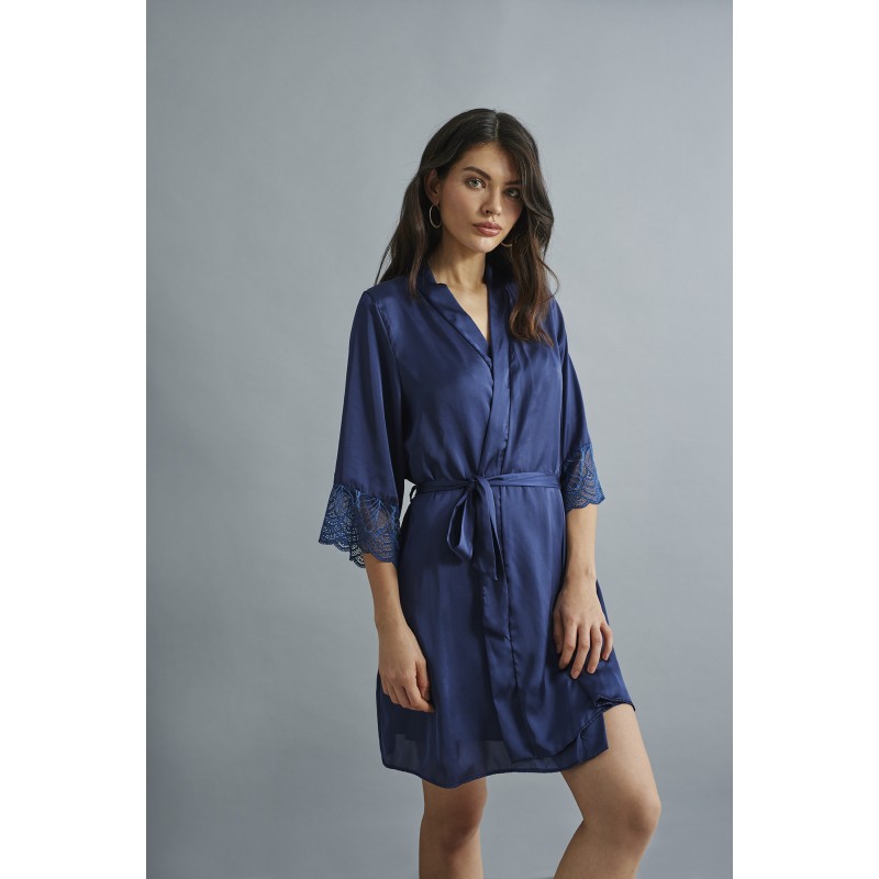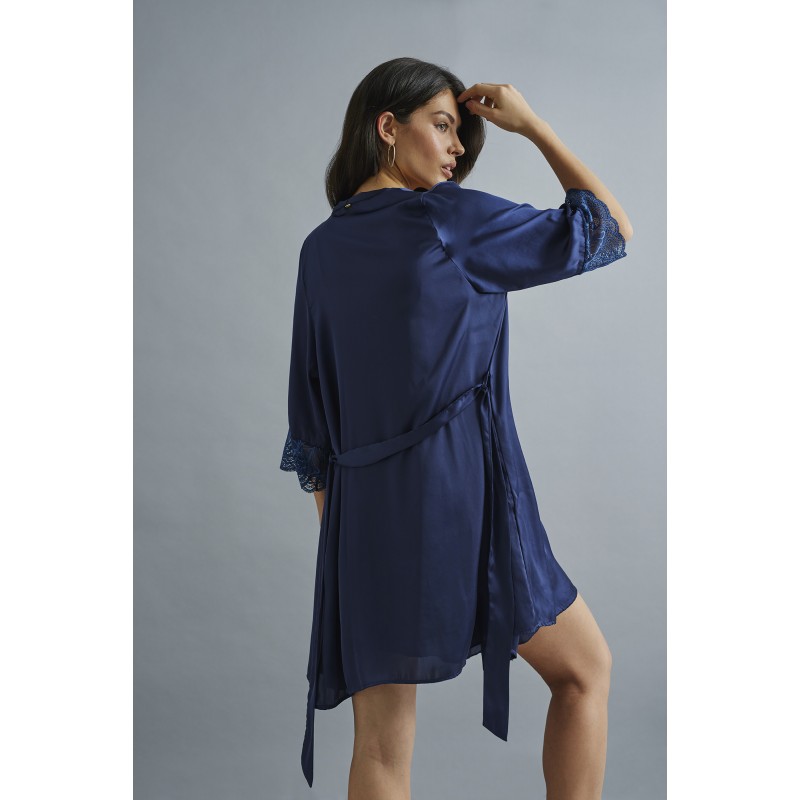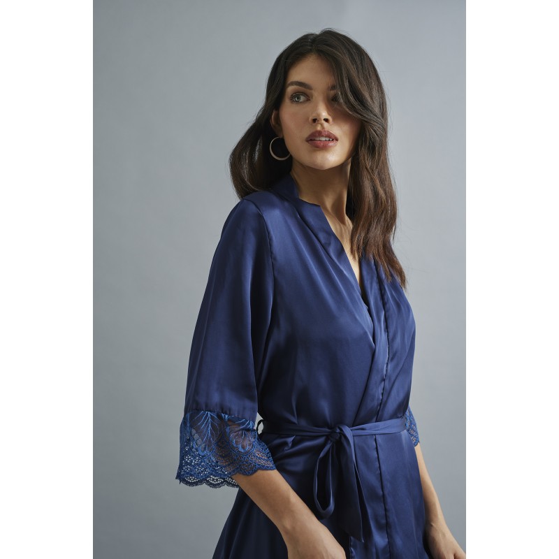 Roupão de cetim com uma estética muito cuidada e ultra feminina com detalhes em renda no decote que a tornam uma peça elegante e ousada.