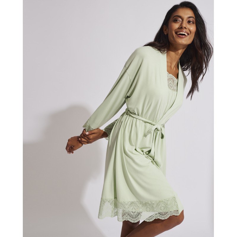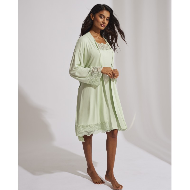 Roupão de lingerie. Seu design clássico com renda nas mangas e bainha confere um estilo romântico e boêmio ao mesmo tempo. Esta peça combina sensualidade, frescura e elegância, ideal para mulheres livres e autênticas.