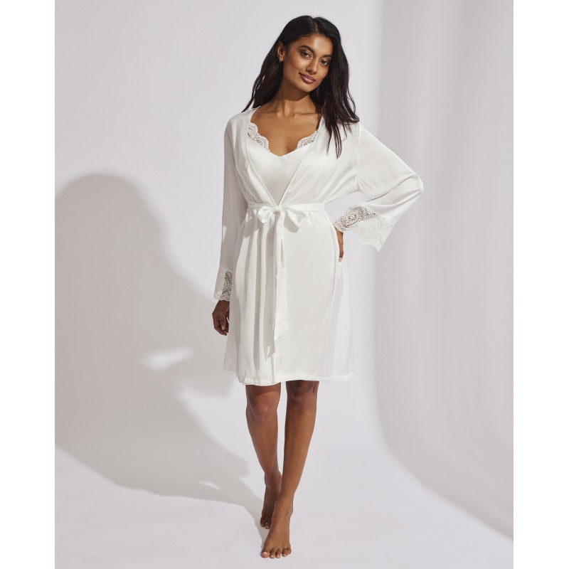 Roupão de lingerie. O seu design clássico com mangas francesas confere-lhe um estilo romântico e boémio ao mesmo tempo. Esta peça combina sensualidade, frescura e elegância, ideal para mulheres livres e autênticas.