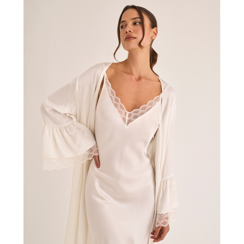 Robe comprido estilo lingerie com atilhos na cintura. Ideal para usar por cima da camisola. Esta peça pertence à coleção Manuela. O seu design combina elegância e conforto, refletindo uma beleza interior que celebra a autenticidade e a autoconfiança. Para mulheres que se sentem bonitas exatamente como são.