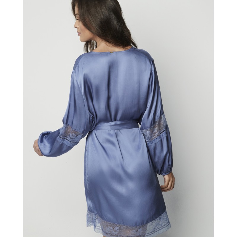 Roupao curto combinado com renda nas mangas e no comprimento da peça, e laço para atar na cintura. Uma peça delicada e sofisticada. A coleção Agatha, à qual pertence, encarna a maturidade e o esplendor da marca, oferecendo peças que não só adornam, como transformam. Uma coleção com charme e carisma.