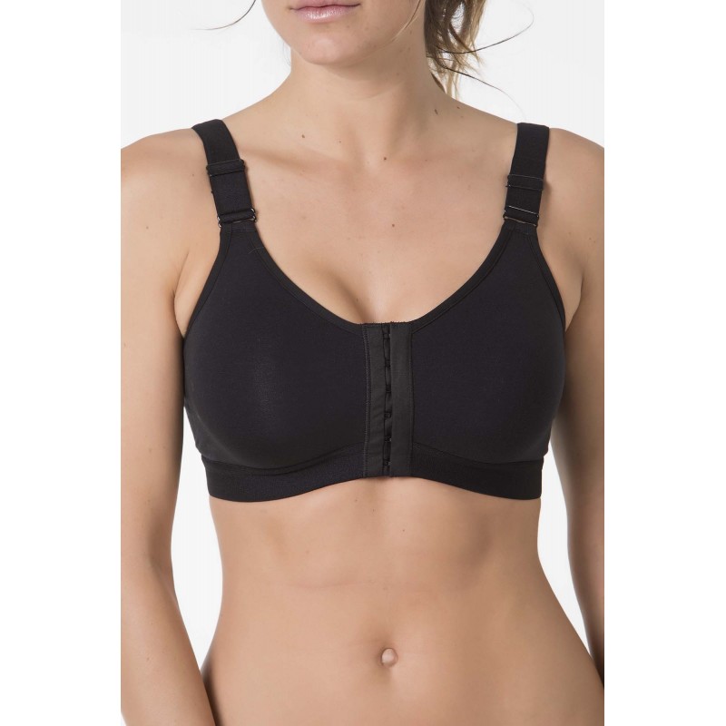 Soutien hipoalergénico envolvente protético sem aros com bolsa e fecho dianteiro. Desenvolvido para mulheres que necessitam integrar uma prótese após uma intervenção de mastectomía ou tumorectomía. Soutien com bolsas em ambos os lados e alças acolchoados com regulador na parte da frente. Em preto.