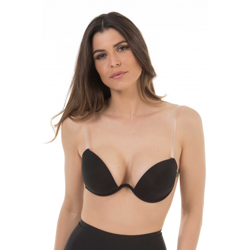 Soutien Push-Up com alças multiposições em tecido e silicone. Com aro continuo e sem costas. Permite usar as alças em varias posições de forma que se adApte aos varios tipos de ropa. Perfeito para looks com costas descobertas. Em preto.