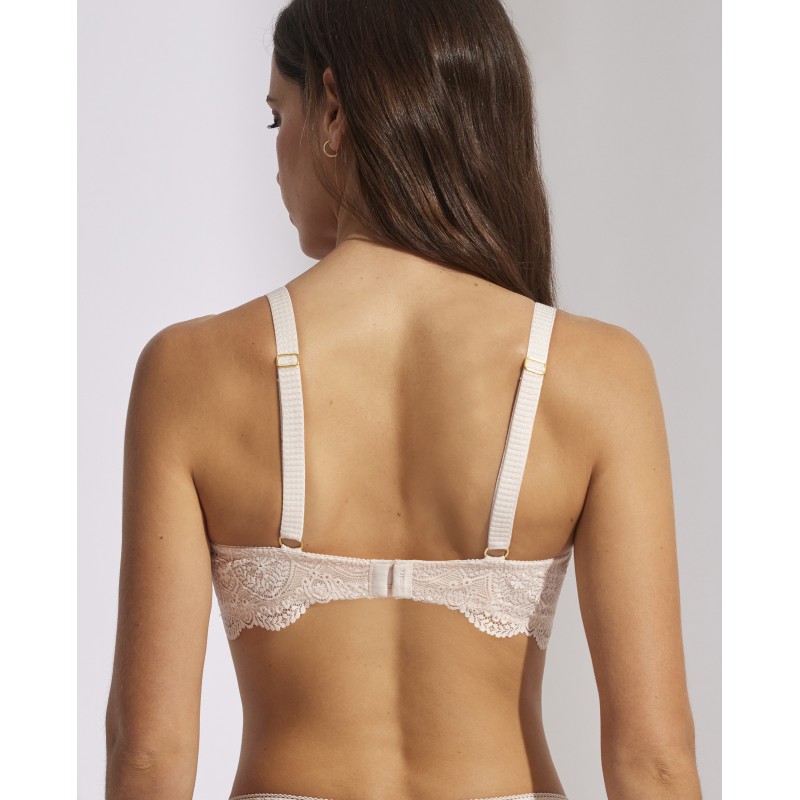 Soutien de capacidade com decote médio. Efeito de controle surround. Ideal para tamanhos maiores. O seu espetacular desenho em renda confere-lhe um estilo romântico e boémio ao mesmo tempo. Esta peça combina sensualidade, frescura e elegância, ideal para mulheres livres e autênticas.