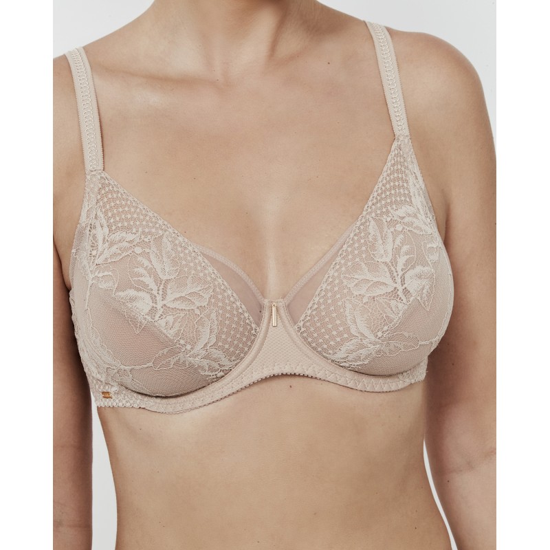 Soutien de renda floral de corte médio com efeito envolvente. Possui aro, base e aros laterais. Sem bojo de espuma. Ideal para tamanhos maiores. As costas são forradas com tule de suporte e as alças vêm em duas larguras, dependendo do tamanho. O fecho de colchete garante um ajuste perfeito para conforto e máxima sustentação. A coleção Malitzia, à qual pertence, representa uma dança perfeita entre o delicado e o ousado.