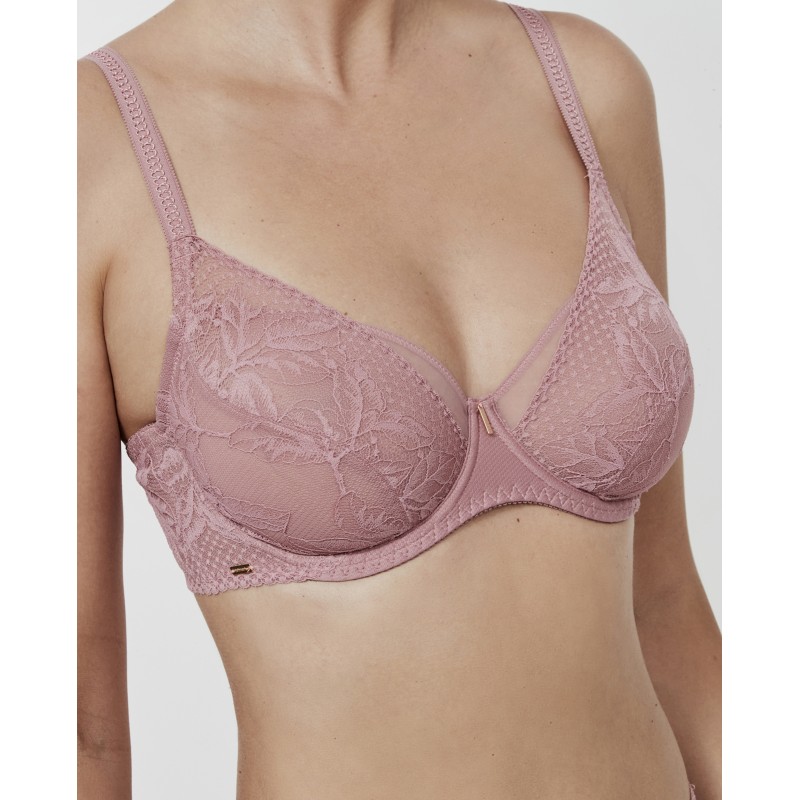 Soutien de renda floral de corte médio com efeito envolvente. Possui aro, base e aros laterais. Sem bojo de espuma. Ideal para tamanhos maiores. As costas são forradas com tule de suporte e as alças vêm em duas larguras, dependendo do tamanho. O fecho de colchete garante um ajuste perfeito para conforto e máxima sustentação. A coleção Malitzia, à qual pertence, representa uma dança perfeita entre o delicado e o ousado.