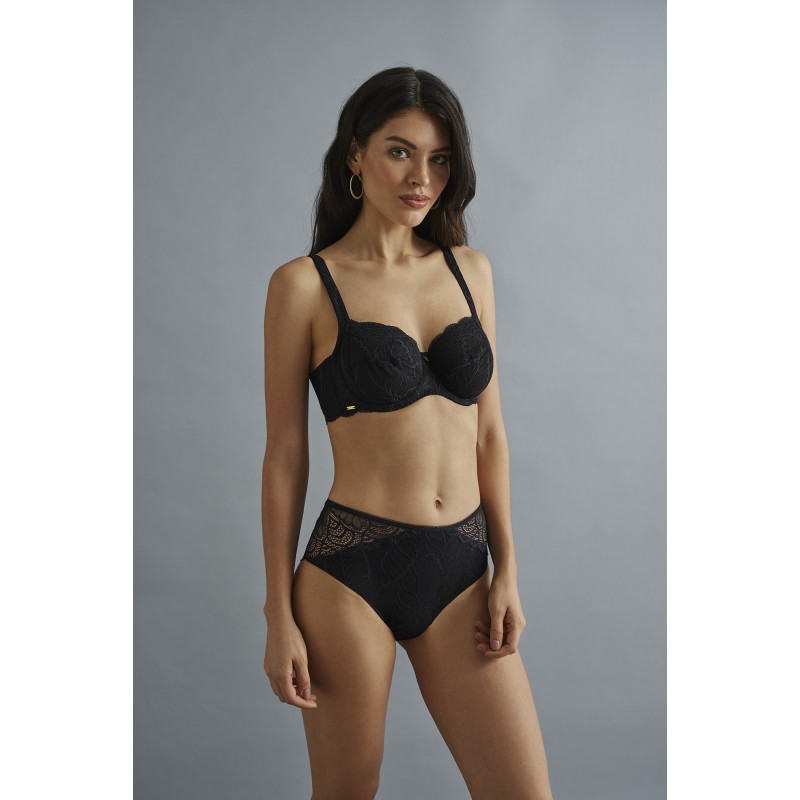 Soutien de grande capacidade. Efeito de controle surround sem enchimento. Ideal para tamanhos maiores. Estética muito cuidada e ultra feminina. A sua renda evoca a natureza das folhas, tornando-a uma peça de roupa elegante e ousada.