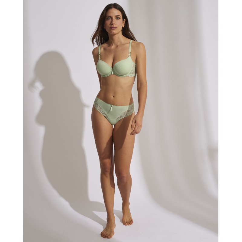 Soutien com copa modeladora. Efeito surround. O seu espetacular desenho em renda confere-lhe um estilo romântico e boémio ao mesmo tempo. Esta peça combina sensualidade, frescura e elegância, ideal para mulheres livres e autênticas.