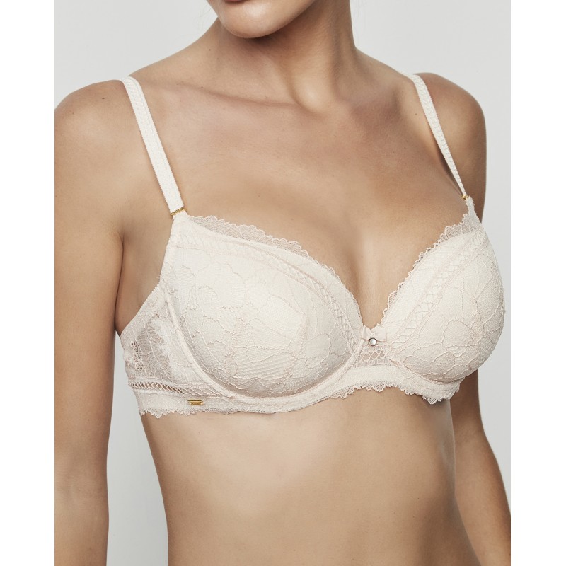 Soutien essencial modelador de renda floral. Possui aros e copas em espuma. Efeito surround. Possui três medidas possíveis de largura das alças consoante o tamanho, como é o caso do seu fecho de fecho. Tudo isto para garantir um grande conforto e um bom suporte. A fivela das tiras é plana, não volumosa. Uma peça delicada e sofisticada. A coleção Agatha, à qual pertence, encarna a maturidade e o esplendor da marca, oferecendo peças que não só adornam, como transformam. Uma coleção com charme e carisma.