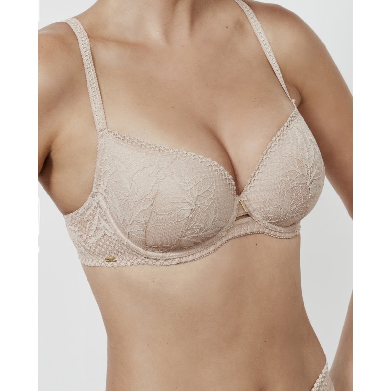 Soutien modelador essencial em renda floral. Possui aro e copas em espuma. Efeito envolvente. Com aro. Estão disponíveis três larguras de alça, dependendo do tamanho, assim como o fecho de colchete. Adicionámos também aros laterais a partir do tamanho 100. Tudo isto para garantir um ótimo conforto e suporte. A coleção Malitzia, à qual pertence, representa uma dança perfeita entre o delicado e o ousado.