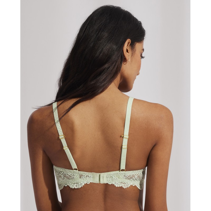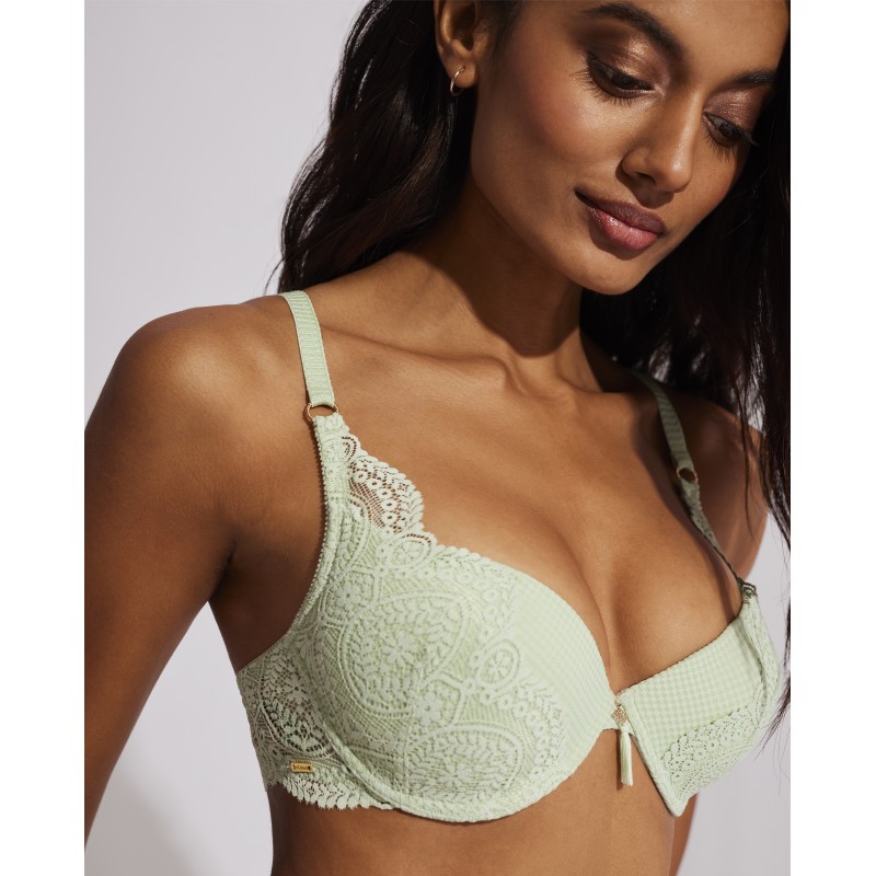 Soutien push up. Firma o peito e aumenta até um tamanho. O seu espetacular desenho em renda confere-lhe um estilo romântico e boémio ao mesmo tempo. Esta peça combina sensualidade, frescura e elegância, ideal para mulheres livres e autênticas.