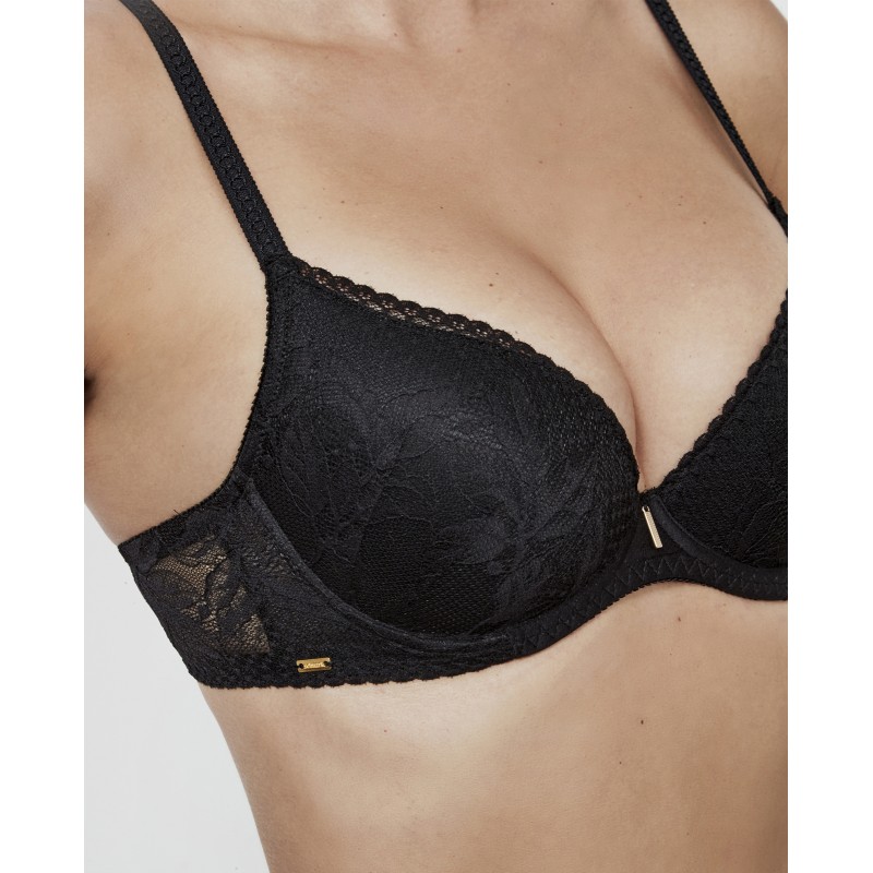 Soutien push-up com decote profundo e renda floral. Refirma o busto e aumenta o volume até um tamanho. Possui aro e copas push-up em espuma. Com base. As suas alças estão disponíveis em dois tamanhos e também possuem ganchos multiposições que permitem a união na parte superior das costas para exibir um decote halter ou costas nadador sem revelar o busto. A coleção Malitzia, à qual pertence, representa uma dança perfeita entre o delicado e o ousado.