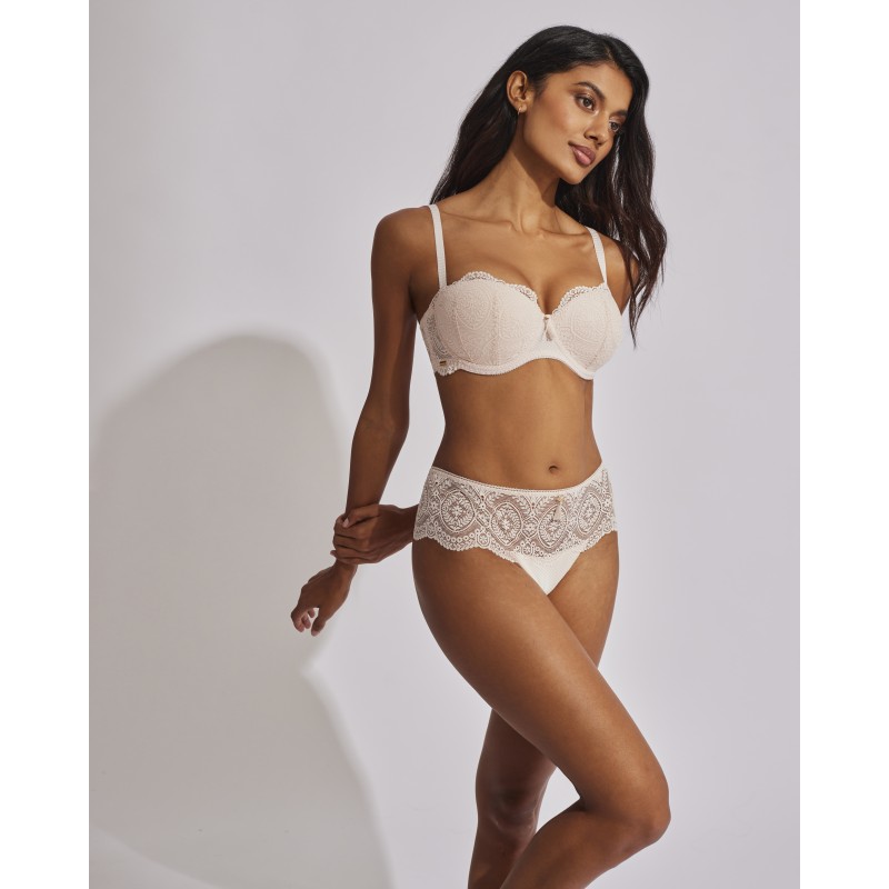 Soutien acolchoado sem alças. Efeito push up, realça o peito e aumenta até um tamanho. O seu espetacular desenho em renda confere-lhe um estilo romântico e boémio ao mesmo tempo. Esta peça combina sensualidade, frescura e elegância, ideal para mulheres livres e autênticas.