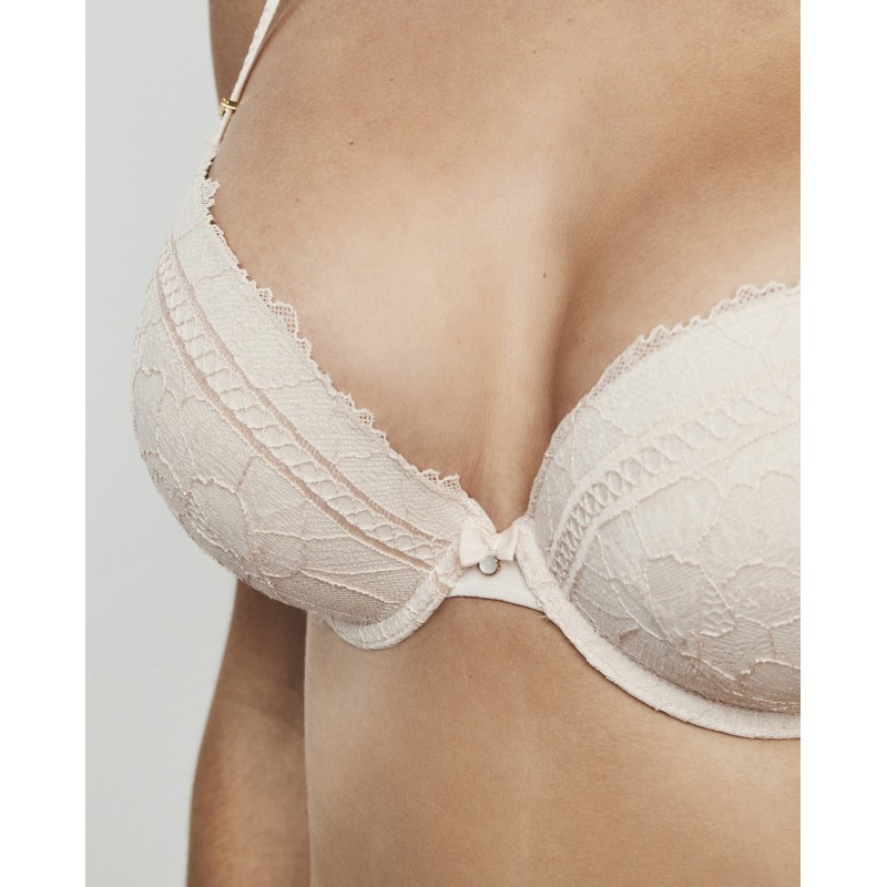 Super soutien com enchimento duplo. Firma o peito e aumenta até dois tamanhos. Possui armação e copas duplas em espuma push-up. Sem base. As suas alças possuem fivelas planas que não ficam volumosas e, além disso, possuem ganchos multiposições que permitem uni-las na parte superior das costas para exibir um decote halter ou costas de corrida sem serem visíveis. Uma peça delicada e sofisticada. A coleção Agatha, à qual pertence, encarna a maturidade e o esplendor da marca, oferecendo peças que não só adornam, como transformam. Uma coleção com charme e carisma.