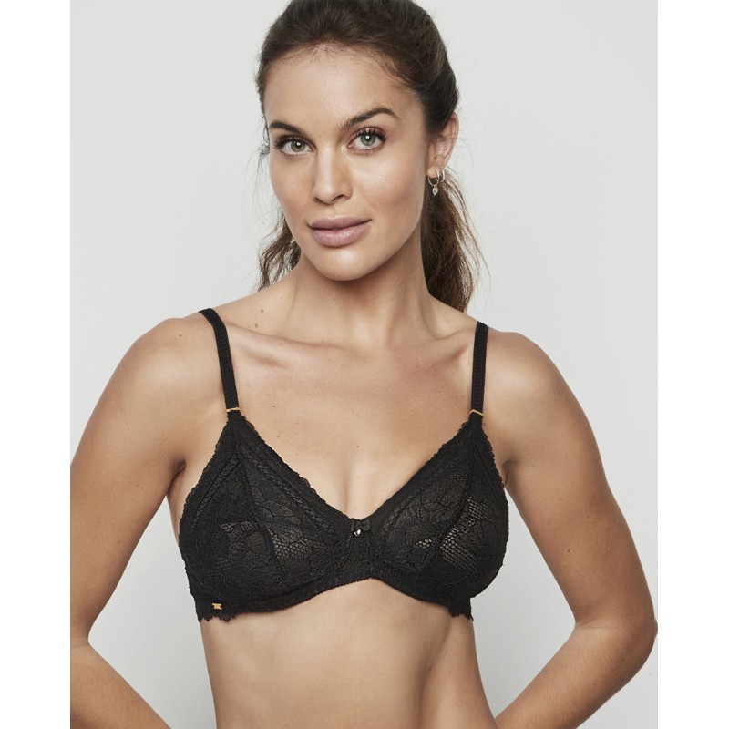 Soutien triangular de renda floral sem aro e sem copa de espuma. Um modelo pensado para proporcionar um conforto extra. O seu interior, tal como o seu ombro, é pré-formado com tule de controlo e possui uma base para dar estrutura. Possui duas medidas de largura das alças consoante o tamanho, como é o caso do seu fecho de fecho, para se adaptar para proporcionar conforto e melhor suporte. Uma peça delicada e sofisticada. A coleção Agatha, à qual pertence, encarna a maturidade e o esplendor da marca, oferecendo peças que não só adornam, como transformam. Uma coleção com charme e carisma.
