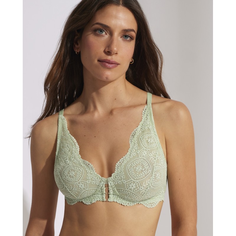 Soutien triangular sem aro e com copa de espuma. Oferece conforto extra. O seu espetacular desenho em renda confere-lhe um estilo romântico e boémio ao mesmo tempo. Esta peça combina sensualidade, frescura e elegância, ideal para mulheres livres e autênticas.