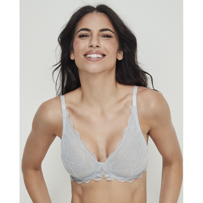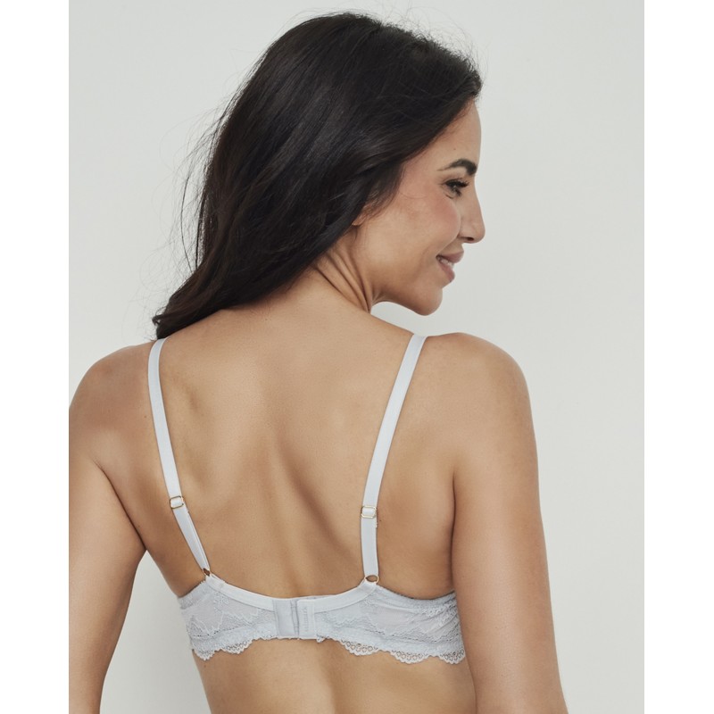 Soutien triangular sem aro ou bojo. As costas são forradas com tule modelador e tem duas opções de largura de alça, dependendo do tamanho, bem como dois fechos ajustáveis ​​com colchetes para garantir um ajuste confortável e com boa sustentação. Uma peça que alia elegância e conforto, criada para mulheres reais, livres e confiantes. Pertence à coleção Manuela, criada para realçar a beleza interior e celebrar a autenticidade de cada mulher. Para quem quer sentir-se não só bonita, mas também confortável e confiante em si mesma.