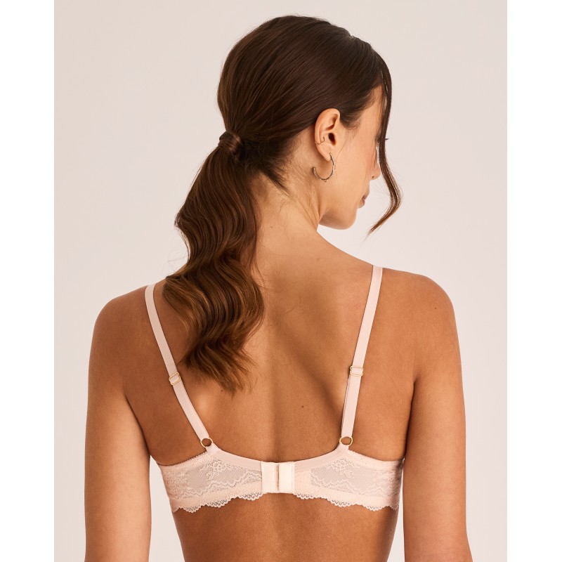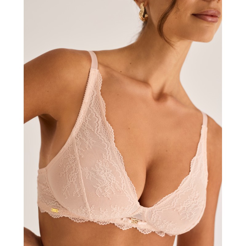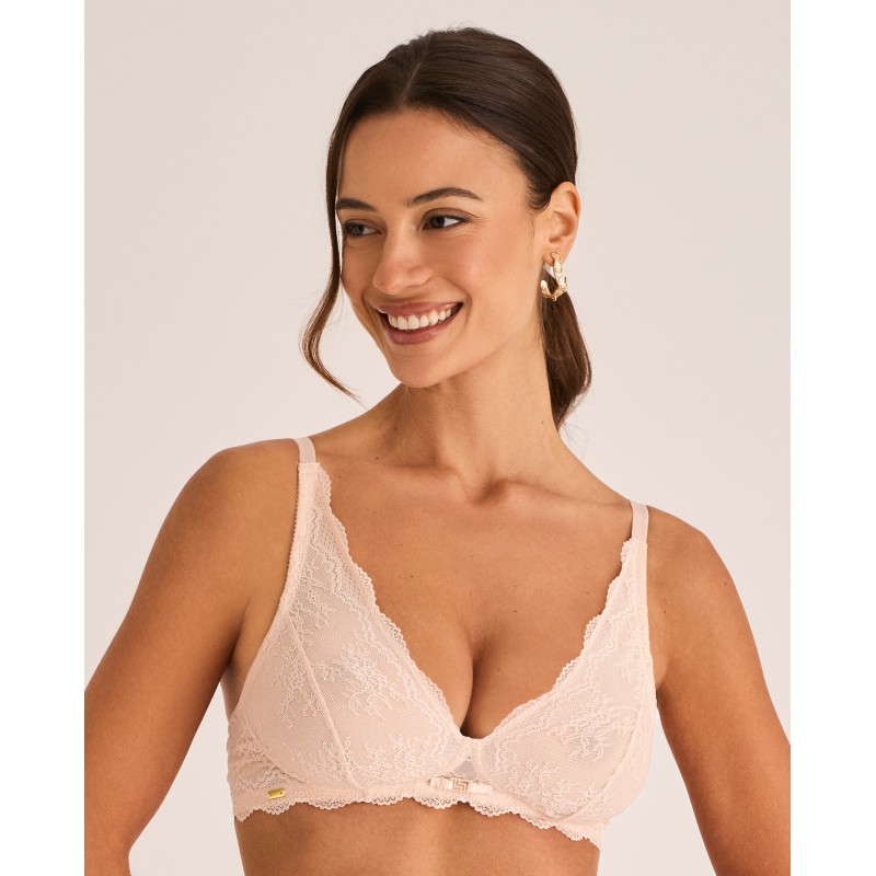 Soutien triangular sem aro ou bojo. As costas são forradas com tule modelador e tem duas opções de largura de alça, dependendo do tamanho, bem como dois fechos ajustáveis ​​com colchetes para garantir um ajuste confortável e com boa sustentação. Uma peça que alia elegância e conforto, criada para mulheres reais, livres e confiantes. Pertence à coleção Manuela, criada para realçar a beleza interior e celebrar a autenticidade de cada mulher. Para quem quer sentir-se não só bonita, mas também confortável e confiante em si mesma.