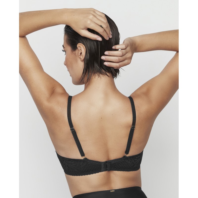 Soutien triangular de renda floral, sem aro e sem copa, estilo bralette. Um modelo pensado para proporcionar um conforto extra. O seu interior, bem como as costas, são pré-moldados com tule de controlo e possuem uma base para estrutura. As alças estão disponíveis em duas larguras, dependendo do tamanho, assim como o fecho de colchete, concebido para se adaptar e proporcionar conforto e um suporte ideal. A coleção Malitzia, à qual pertence, representa uma dança perfeita entre o delicado e o ousado.