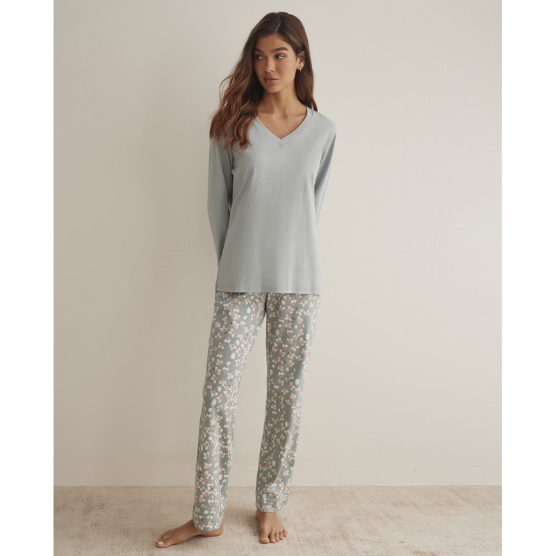 Pijama de mulher de duas peças composto por uma t-shirt com decote em V e mangas compridas e calças compridas. Combine a t-shirt lisa monocromática com o estampado floral da calça. O seu tecido 100% algodão torna-a numa peça confortável e quente, ideal para as noites frias.