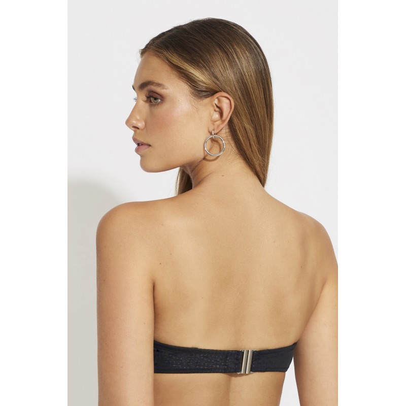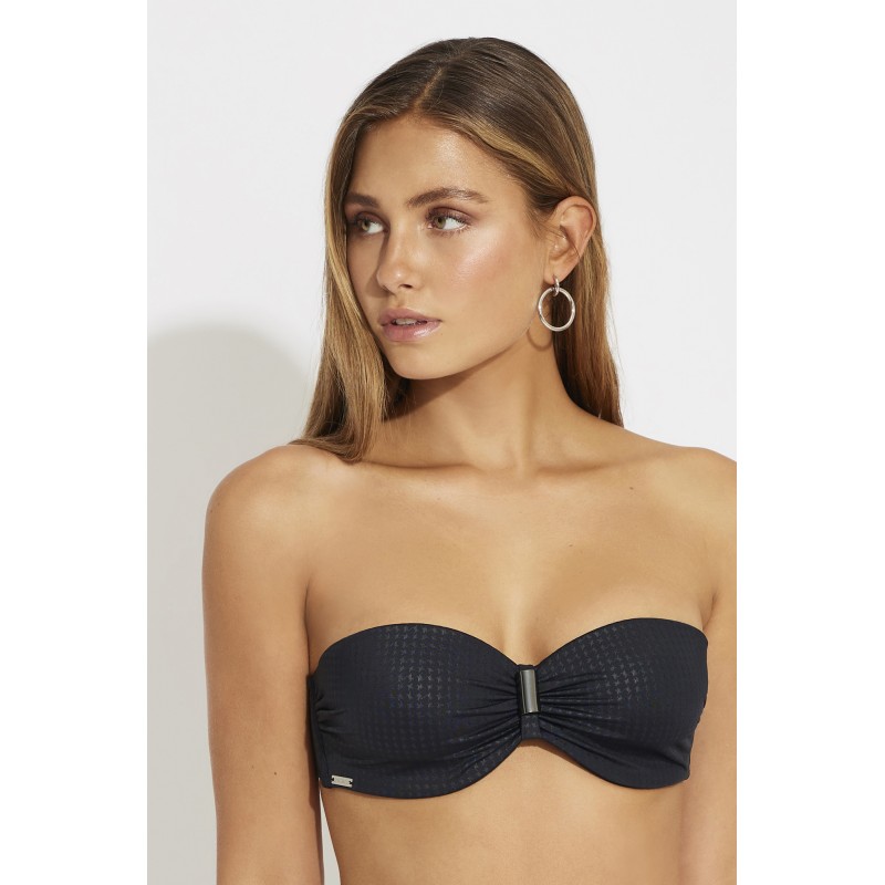 Top de bikini bandeau com aro e copa. Com um detalhe que agrega elegância a esta peça e a torna uma alternativa ideal entre seus trajes de banho.