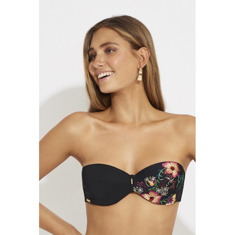 Top debikini bandeau com aro e copa. Em preto e com um bordado floral sedutor e feminino que se destaca por si só, vai fazer com que se sinta irresistível nesta estação.