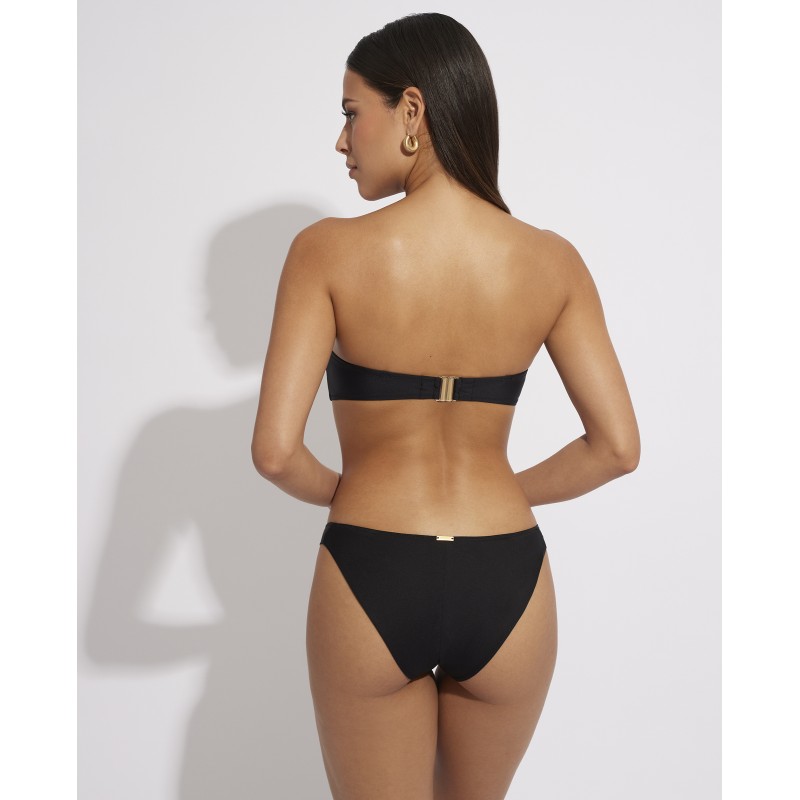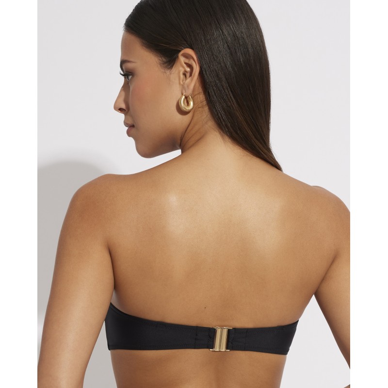 Top de biquíni bandeau com armação e copa. Este design destaca a elegância da cor preta e acrescenta um toque de luxo com seus detalhes dourados, combinação que transmite sofisticação e estilo. Ideal para se sentir esplêndido neste verão.