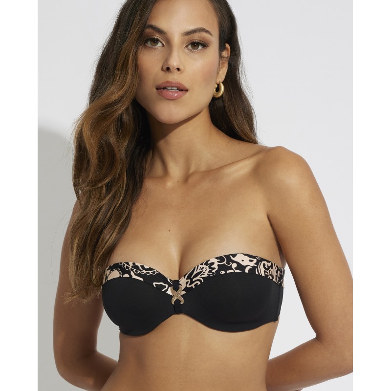 Top de biquíni bandeau com armação e copa. Com alças removíveis. Este design apresenta um padrão refinado e estilizado que destaca seu bom gosto e elegância.