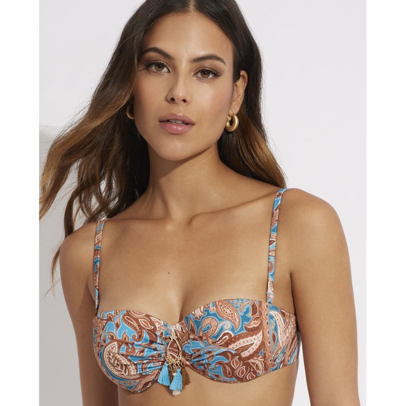 Top de biquíni bandeau com armação e copa. Com alças removíveis. O seu design étnico confere-lhe um toque de originalidade e estilo único, tornando esta peça diferente das outras. Suas cores vibrantes destacam suas curvas de forma sutil, mas impactante.