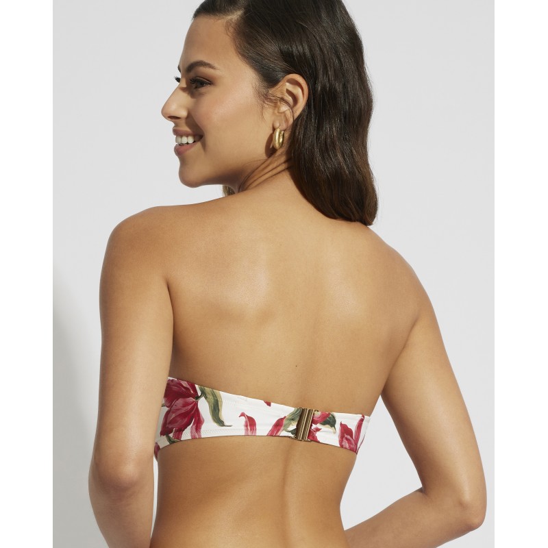 Top de biquíni bandeau com armação e copa. Com estampa tropical que evoca a beleza de uma ilha paradisíaca. A sua cor e frescura transmitem a alegria e a energia da estação mais esperada do ano.
