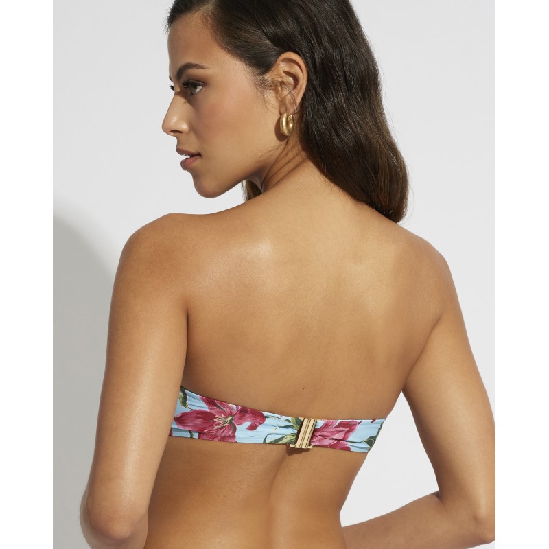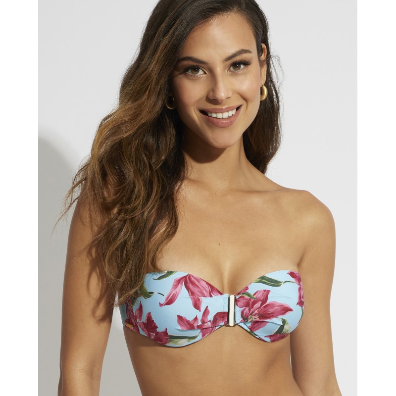 Top de biquíni bandeau com armação e copa. Com estampa tropical que evoca a beleza de uma ilha paradisíaca. A sua cor e frescura transmitem a alegria e a energia da estação mais esperada do ano.