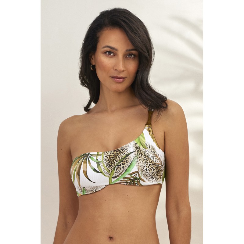 Top de bikini estilo bandeau assimétrico. Apresentando uma estampa tropical selvagem inspirada no paraíso. Ideal para esta estação.