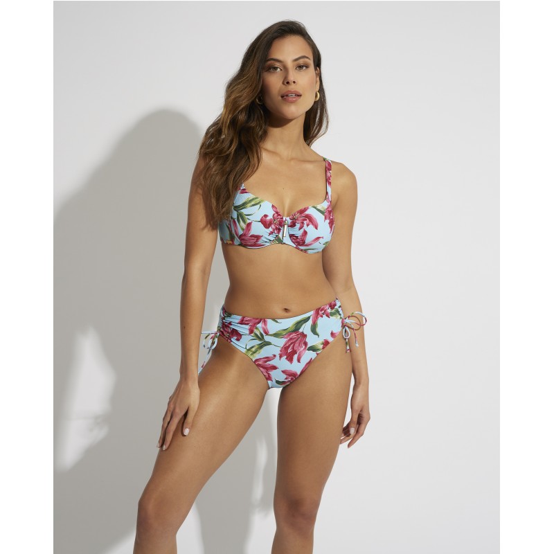 Top de biquíni com capacidade sem espuma. Com armação e alças ajustáveis ​​para garantir um suporte perfeito. Com estampa tropical que evoca a beleza de uma ilha paradisíaca. A sua cor e frescura transmitem a alegria e a energia da estação mais esperada do ano.