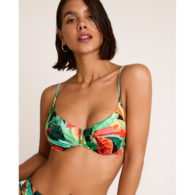 Top de biquíni com cobertura total, sem enchimento. Possui aro e alças ajustáveis ​​para um ajuste perfeito. Inspirado na natureza exuberante, este estampado tropical é ideal para banhos de sol e momentos à beira-mar.