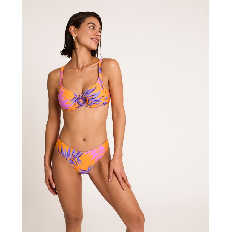 Top de biquíni com cobertura total, sem enchimento. Possui aro e alças ajustáveis ​​para um ajuste perfeito. Estampado tropical em cores vibrantes de verão. Ideal para desfrutar do sol nesta estação. Feito com materiais reciclados.