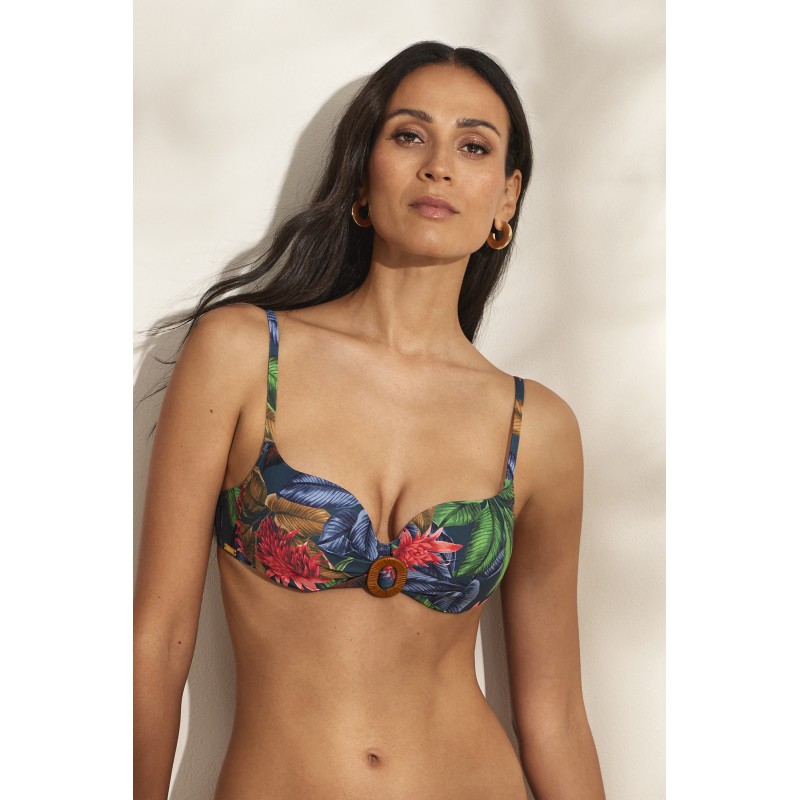 Top de bikini com aro e copa em espuma. Um design clássico com alças que oferece suporte perfeito e máximo conforto. Um design muito verão com uma estampa tropical. Uma peça carregada de cor e frescura.